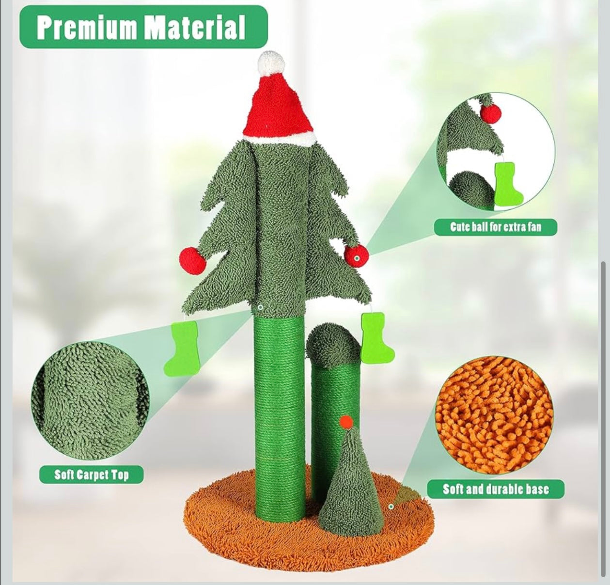 32” Cat Scratching Post, Tall Christmas Tree Cat Scratcher with 3 Posts and Cute Dangling Teaser Balls